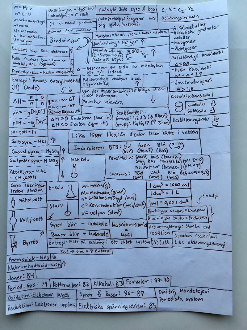 Hej! Jag behöver inte hjälp med en fråga utan jag tänkte bara lägga ut min förberedelse lapp inför kursprovet i kemi 1. I gymnasiet jag går i får man ta med sig ett A4 papper där man får skriva upp formler, begrepp och så vidare som stöd när man skriver prov. När jag skulle förbereda min lapp/"fusklapp" så försökte jag hitta exempel online, men jag kunde inte hitta något. Därför tänkte jag lägga ut mitt "fuskpapper" så att andra kan använda den under sin förberedelse.
