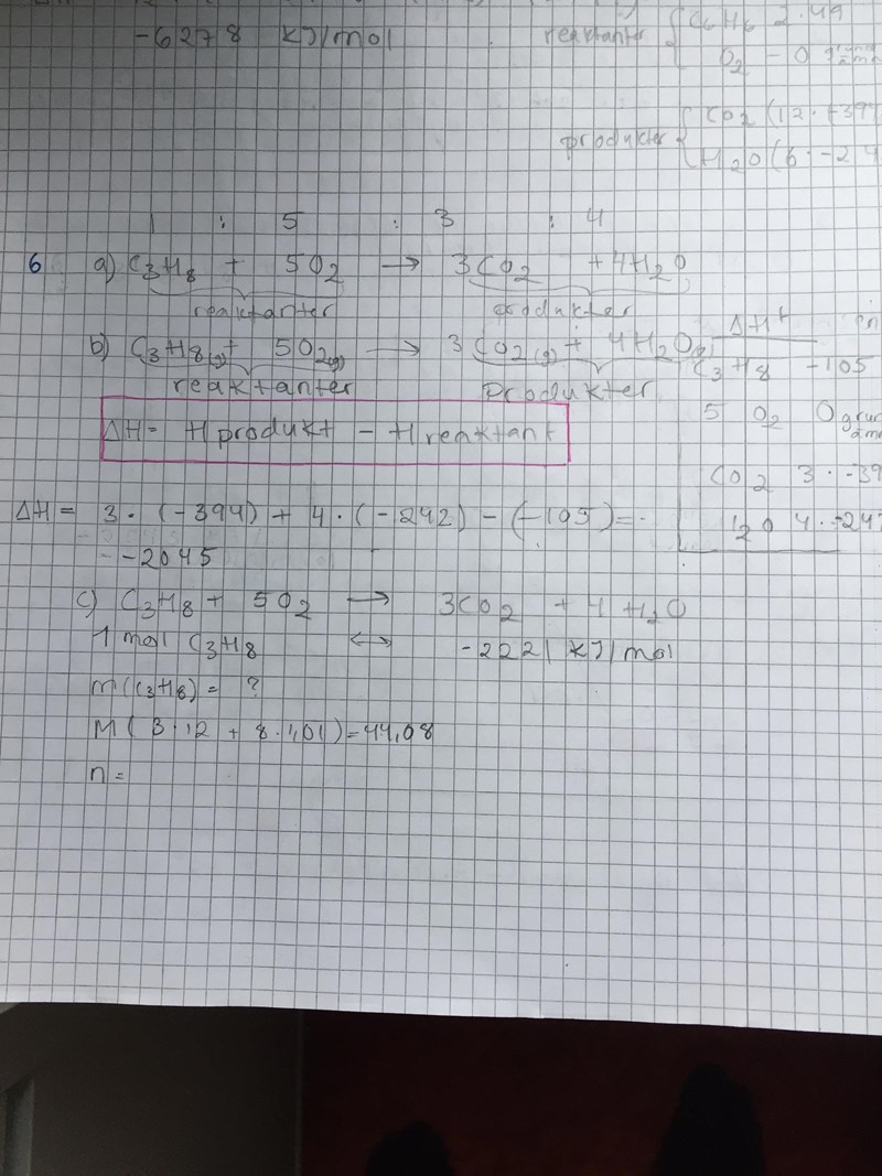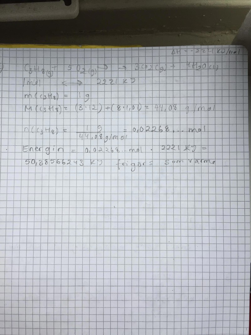 c) Hur mycket värme får man alltså ut per mol propan