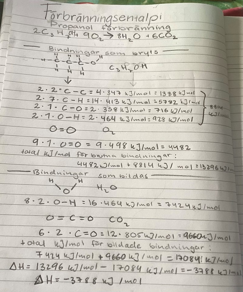 Jag försöker lösa en uppgift där jag ska beräkna förbränningsentalpin för propanol genom att kolla på vilka bindningar som bryts och vilka som bildas. Jag har kommit fram till detta svar i min beräkning men det är inte rätt, kan någon berätta vad jag har gjort fel?