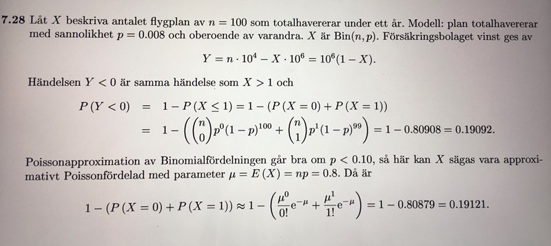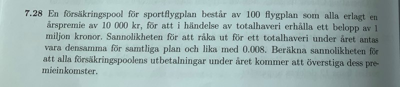 Finns det något som gör att man inte kan lösa det som man skulle ha gjort i Ma1? Försäkringspoolen kommer att klara sig om et sker 0 eller 1 haverier, och går back om det sker 2 eller fler haverier. Sannolikheten att inget plan havererar är (1-0,008)100. Sannolikheten att exakt 1 plan havererar är 100.0,008(1-0,008)99. Sannolikheten att försäkringspoolen går back är komplementhändelsen, d v s 1-((1-0,008)100+100.0,008(1-0,008)99). Jag får det till 19 %.