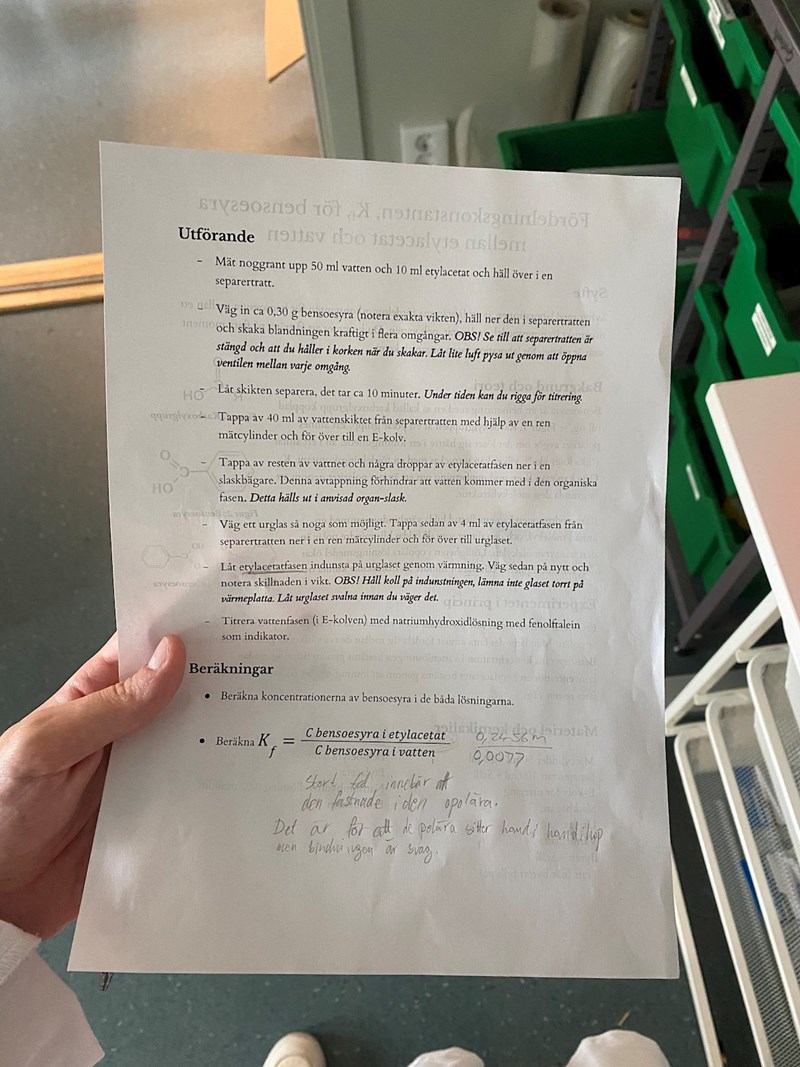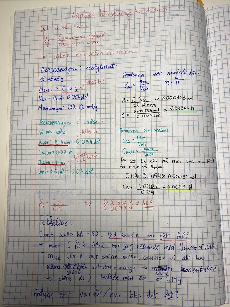 4. Betyder en hög fördelningskonstant att benseosyran reagerade mest i etylacetaten?