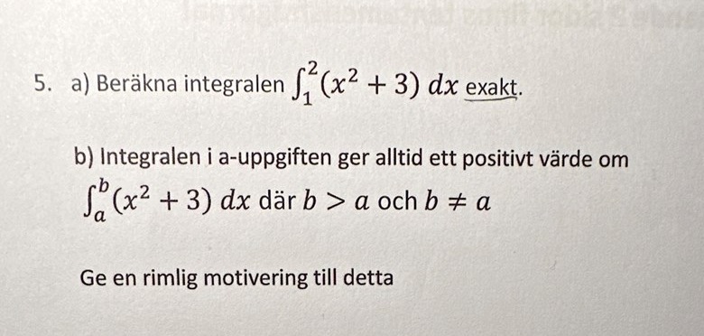 Du ser då att parabeln ligger ovanför x-axeln överallt, vilket innebär att integralen har ett positivt värde för alla och sådana att .