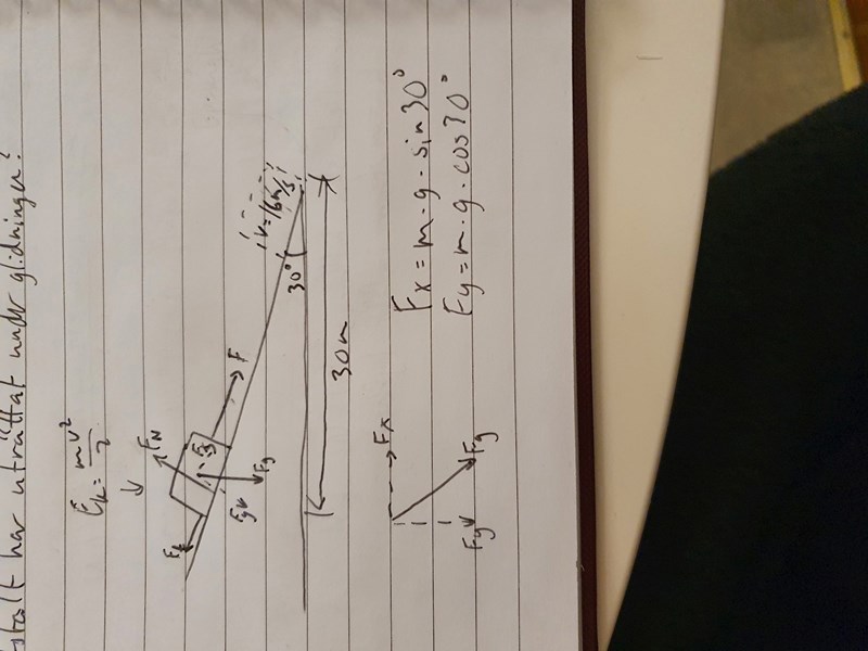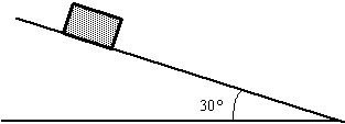 Ett föremål med massan 5 kg startar från vila (stillestånd) och glider utför ett 30 m långt lutande plan. Vinkeln mellan det lutande planet och horisontalplanet är 30°.