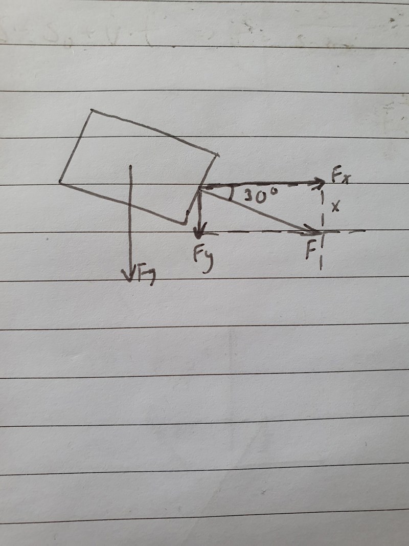 Ritade om bilden såhär. Tänker eftersom att Fx är i samma riktning och vinkel som sträckan (30m) så borde den vara intressant och därav motsvara kraften i den riktningen.