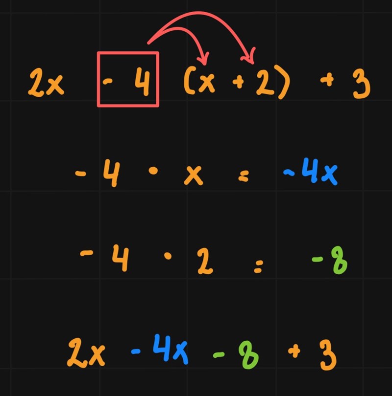 Tänk på att det ALLTID finns ett tecken framför ett tal, plus eller minus, plus är oftast osynligt. Och du måste multiplicera hela talet, inklusive tecknet innan, med talen i parentesen. Hoppas du kan komma vidare!
