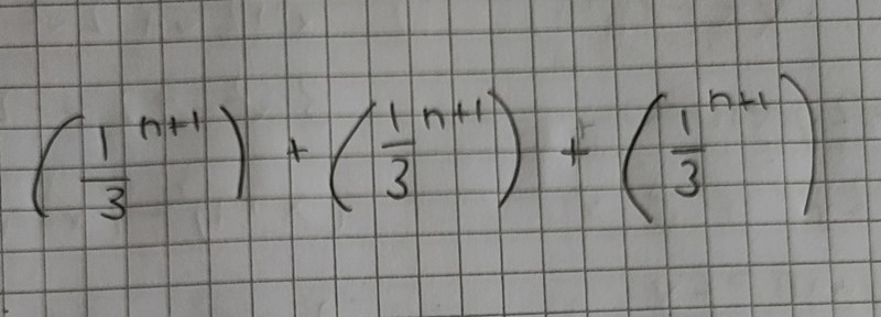 (1/3)^1= 1/3, och om vi tar det gånger 3 så får vi en 1 kvar. Då blir det 1 × (1/3)^n som är samma sak som (1/3)^n. Går det att förenkla ännu mer eller är man nöjd med (1/3)^n ? (:
