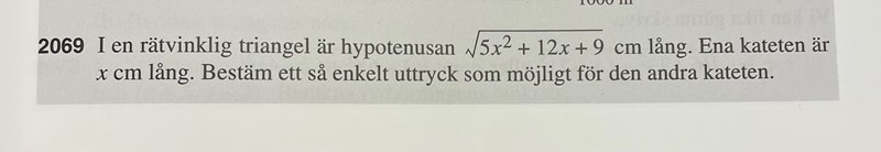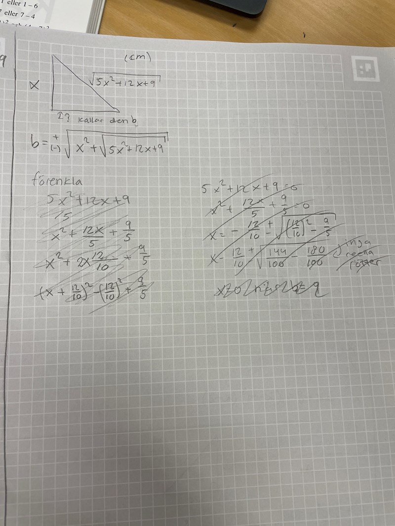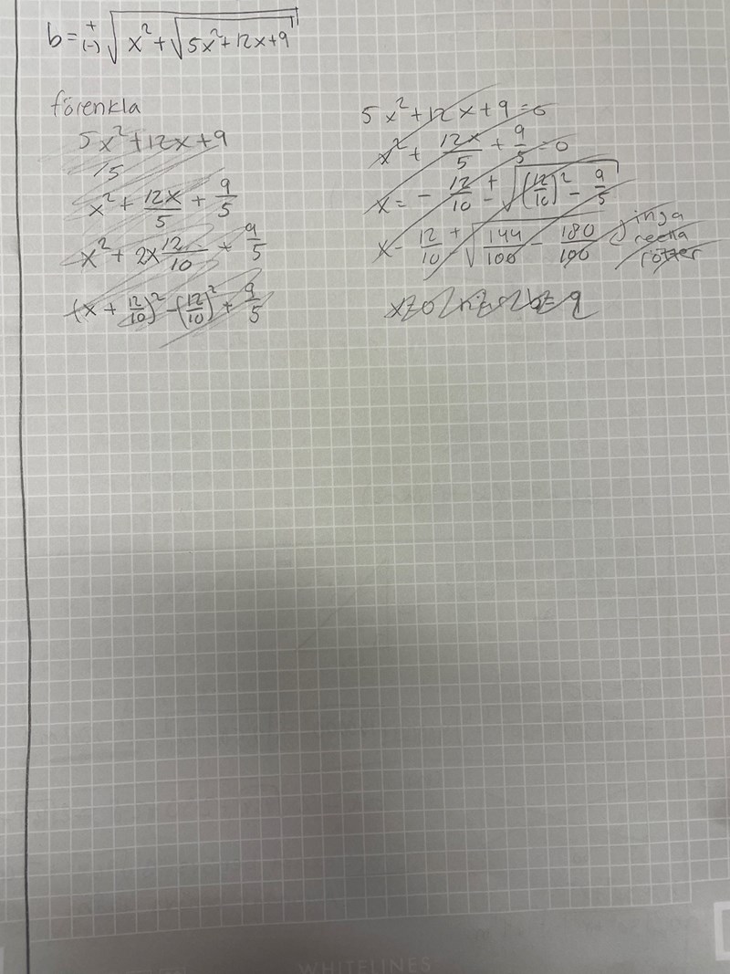 vänster sida är att jag försökte med kvadratkomplitering och höger är att jag tänkte att jag kunde faktorisera uttrycket genom att hitta rötterna men det fanns inga… ja har ju endast provat att förenkla 5x2+12x+9 hittills för det kändes som man skulle börja där men det kanske är fel tänkt. Och ja ser även inte att de skulle gå med kvadrat/konjugat reglerna men ja kanske tänker fel där med…?