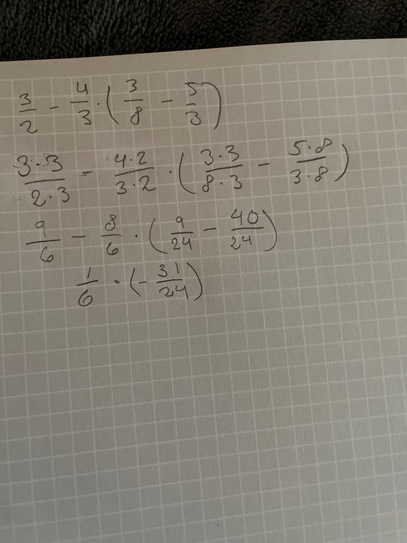 Förenkla (3/2)-(4/3) * ((3/8)-(5/3))