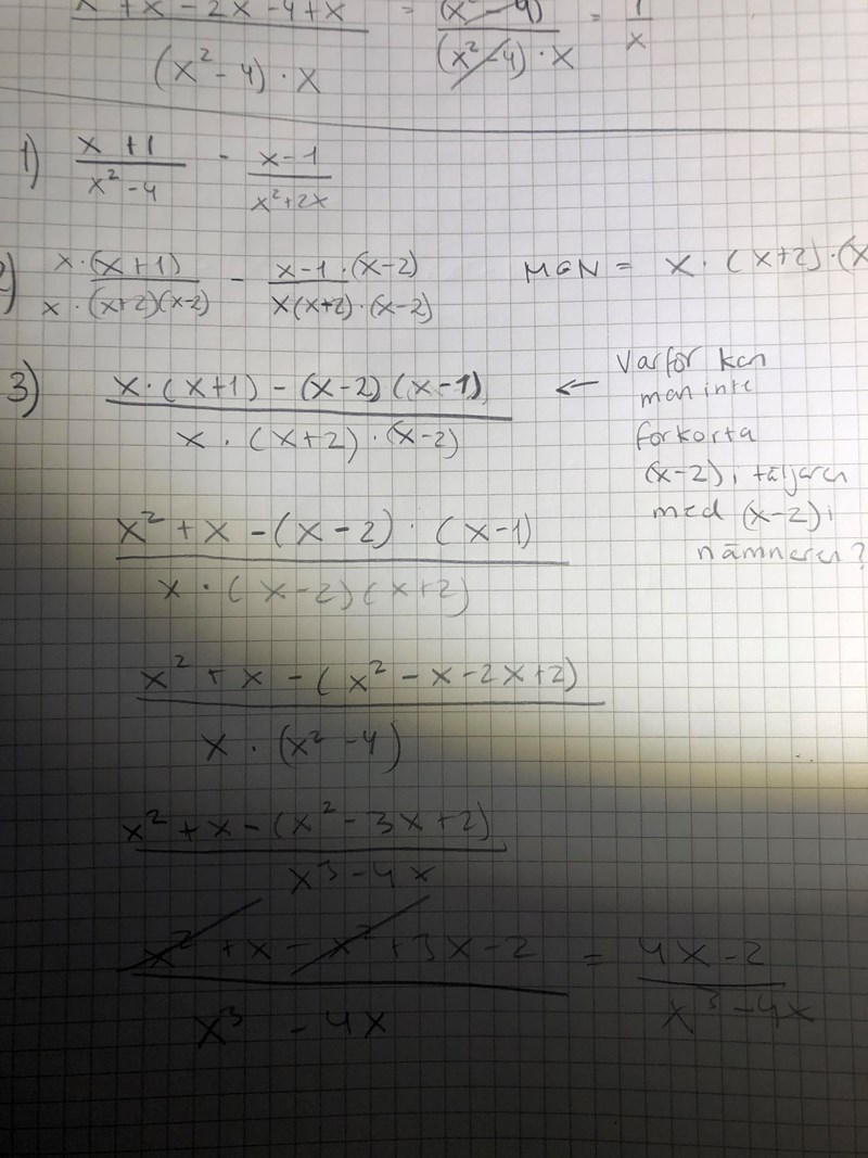tredje steget i min uträkning förvirrar mig. Varför kan man inte förkorta (x-2) i täljaren med (x-2) i nämnaren?