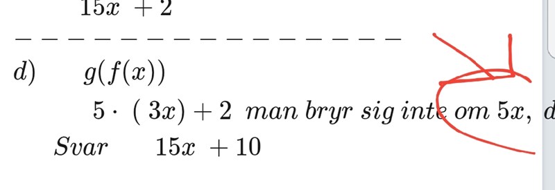 b-uppgiften: I uttrycket för f(x), dvs 3x + 2 ska du alltså ersätta x med g(x), dvs du ska ersätta x med 5x.