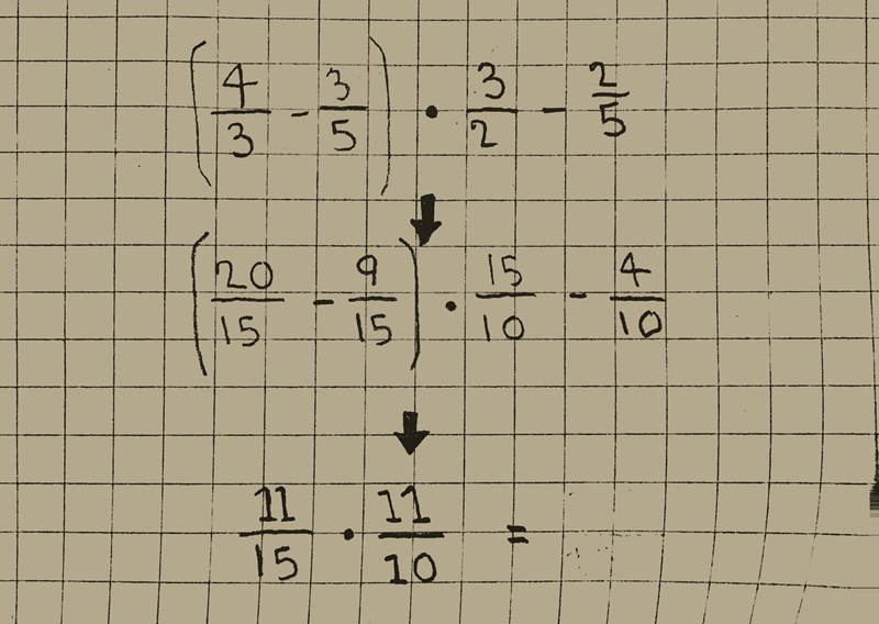 Jag kollade inte ingen dina beräkningar först. Men nu när jag gjorde det så ser jag att du har räknat subtraktionen 15/10 - 4/10 innan du har beräknat multiplikationen (20/15 - 9/15)*15/10. Så du ska beräkna denna före du beräknar subtraktionen.