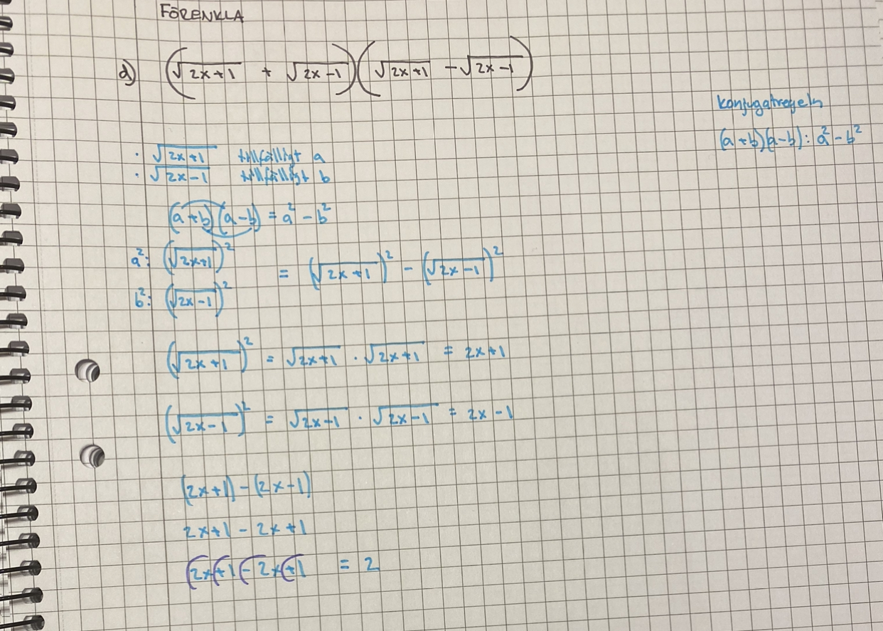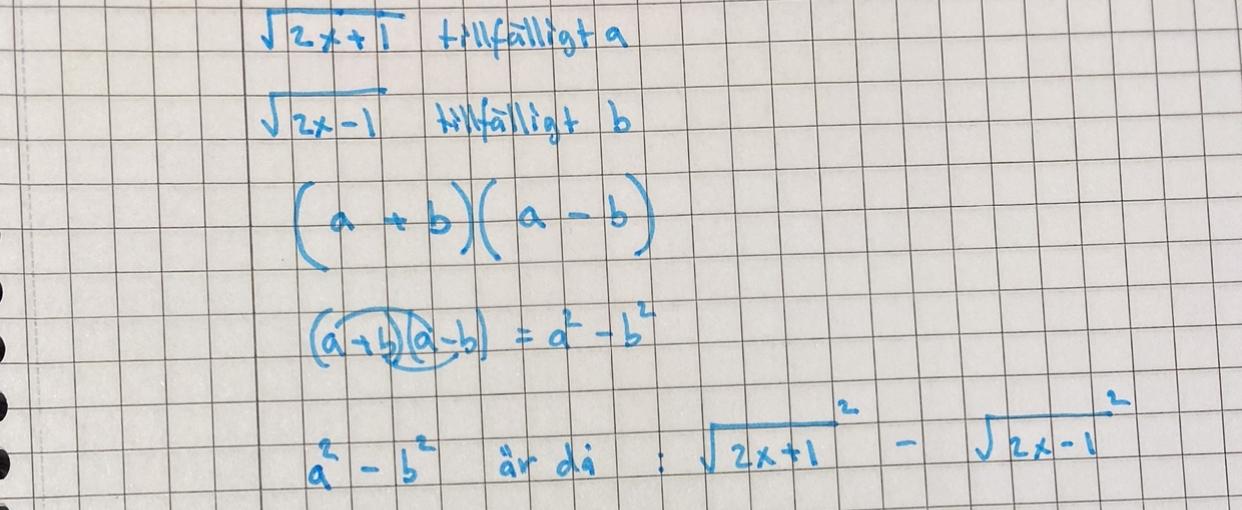 känns bara ovant att ha och skriva så mycket under rot tecknet alltså exempel 2x+1 men lika bra att öva in det, lär komma flera såna uppgifter