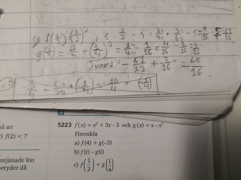 bilden kanske inte visar så bra men jag försökte lösa uppgift c och detta var det närmaste jag kom till svaret som är : -49/16