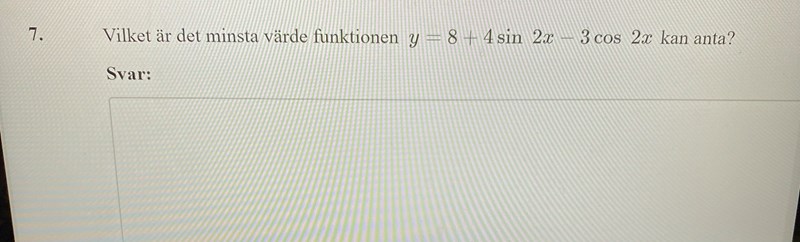 Koeff för sin och cos är 4 resp. -3. 42 +(-3)2 =52 . Då finns en vinkel v sådan att 5 cos v=4 och 5 sin v = -3, Med summaformeln (baklänges) får vi y=8 +5 sin(2x+v) . Härifrån tror jag du klarar grejen. (Finessen är att vinkeln v kan men behöver inte bestämmas.)
