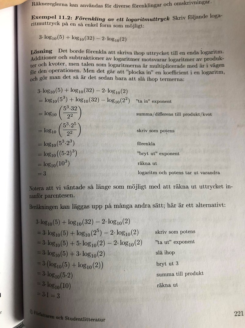 Välkommen till Pluggakuten! När du skriver 2xlog9(90), menar du då ? Du kommer inte att få log9 lika med något, då har du gjort fel. Det är ett uttryck du fått. Du kan inte få något lika med något annat. Men börja såhär. Ta ett uttryck i taget, och skriv det på så enkel form som möjligt: