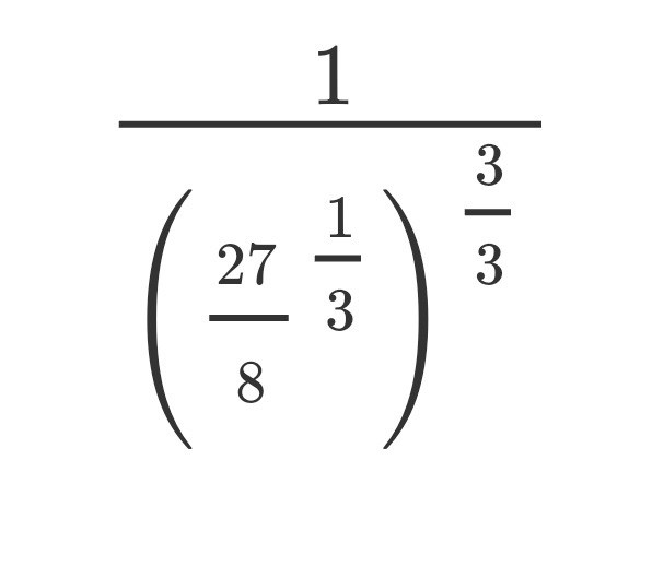 Du kan börja med att skriva om till , och så kan du skriva om 27 och 8 med bas 3 respektive 2. Hur ser uttrycket ut när du har gjort detta?