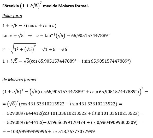 -104 ligger ju väldigt nära det värde du fickpå realdelen - avrundingsfelen är begripliga. Hur nära kommer du om du delar din imaginärdel med 5\sqrt5?