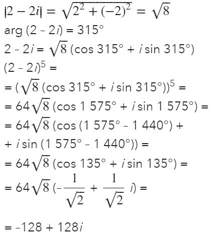 z=8(cos(135°)+i·sin(135°))z5=(85(cos(5·135°)+i·sin(5·135°))=84·81(cos(675°)+i·sin(675°))=64·8(cos(675°)+i·sin(675°))