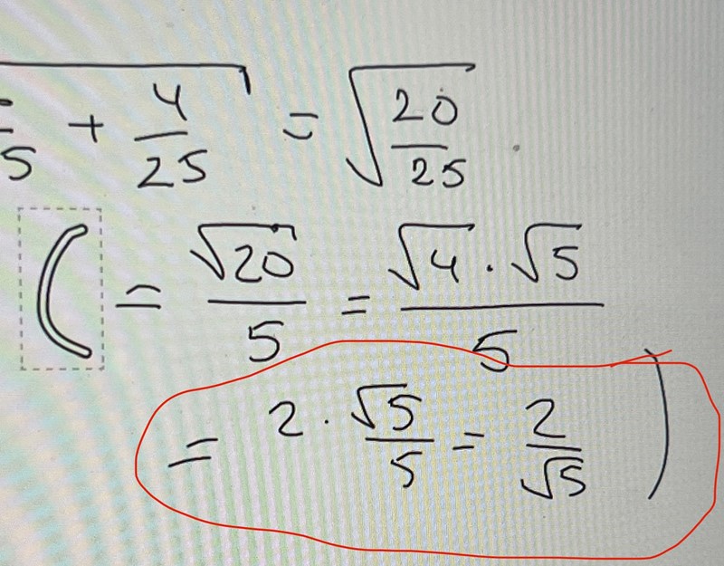 Hm förstår inte riktigt ändå. Detta är läraren lösning och jag hänger med till 2*roten ur 5/5 men sen förstår jag inte hur det han bli 2/roten ur 5