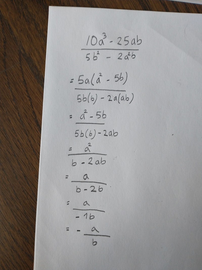 Uttryck: (10a^3 - 25ab) / ( 5b^2 - 2a^2b)