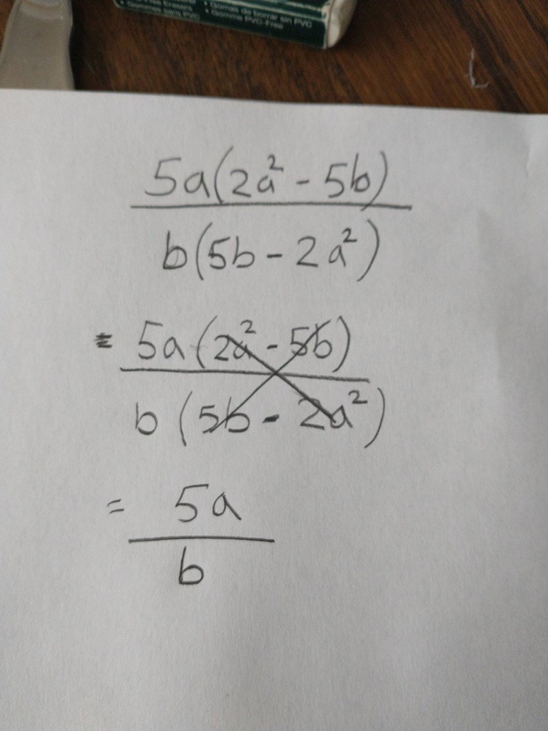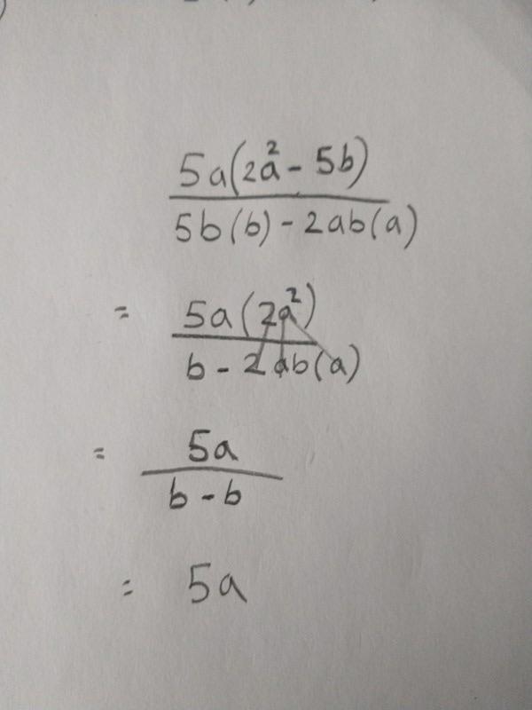 Det ser ut som att du plockar bort litet vad som helst. Man kan förkorta (bryta ut, sen förkorta) bort något som är en faktor i varje term, inget annat. 5b är inte en faktor i 2a2.
