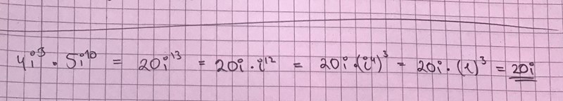 Hej, jag ska förenkla följande tal: 4i^3 * 5i^10 vilket jag gjort till 20i. Men jag har ändå en fråga. Kan man tänka att när man utfört multiplikationen och fått 20i^13, går det att bryta ut så att man får 20i * i^12 och tänker att alla i med jämn exponent ger 1 och udda exponent ger -1?