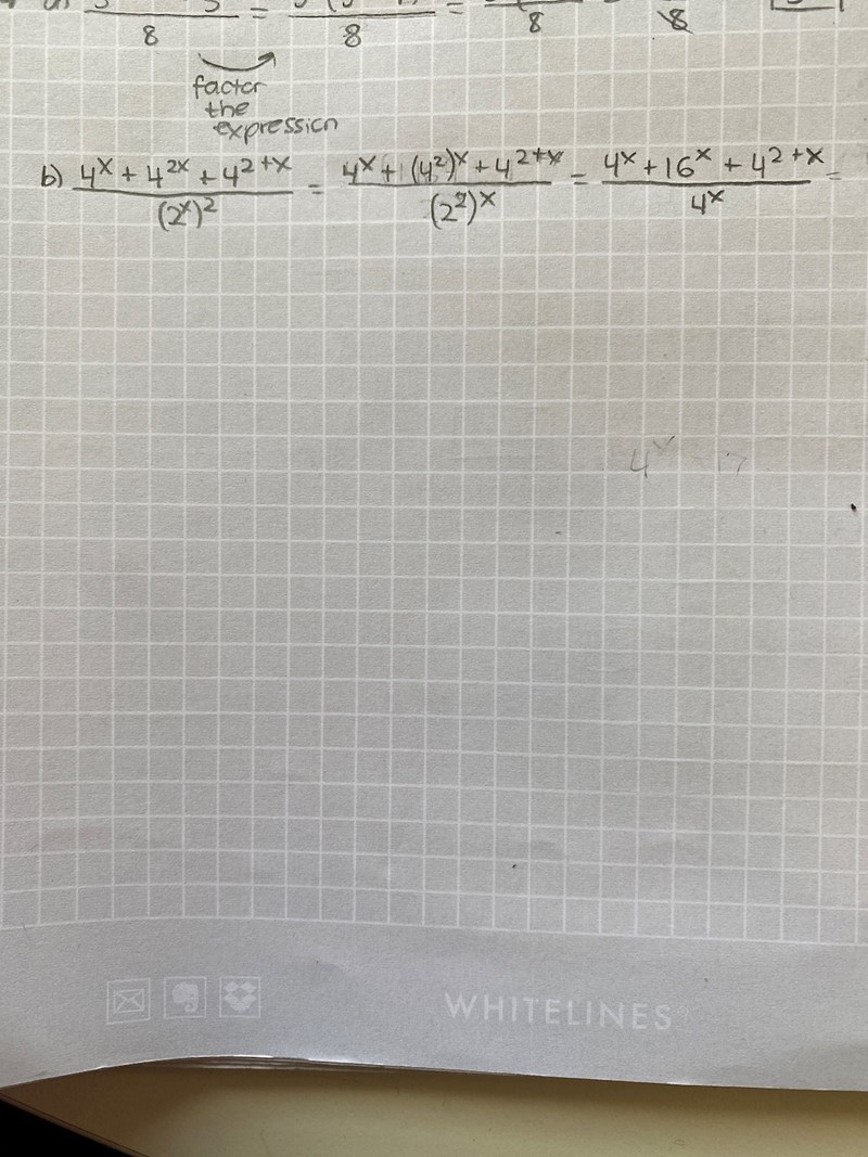 Det går väl bara att förkorta bort 4^x om man faktoriserar? Hur kan man faktorisera 4^2x