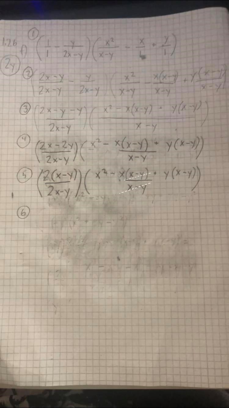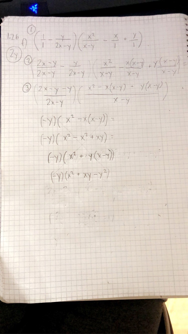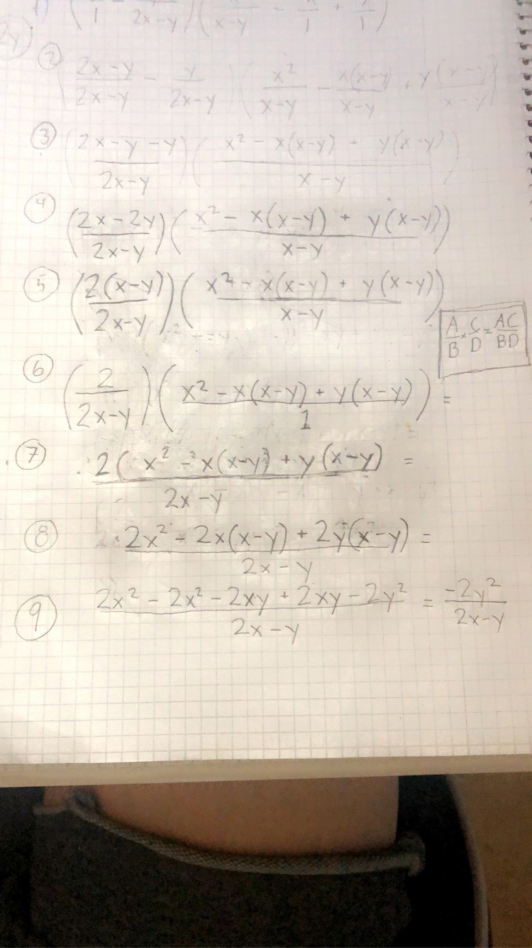 22x-y·x2-x(x-y)+y(x-y)1\dfrac{2}{2x-y}\cdot \dfrac{x^2 - x(x-y)+y(x-y)}{1}