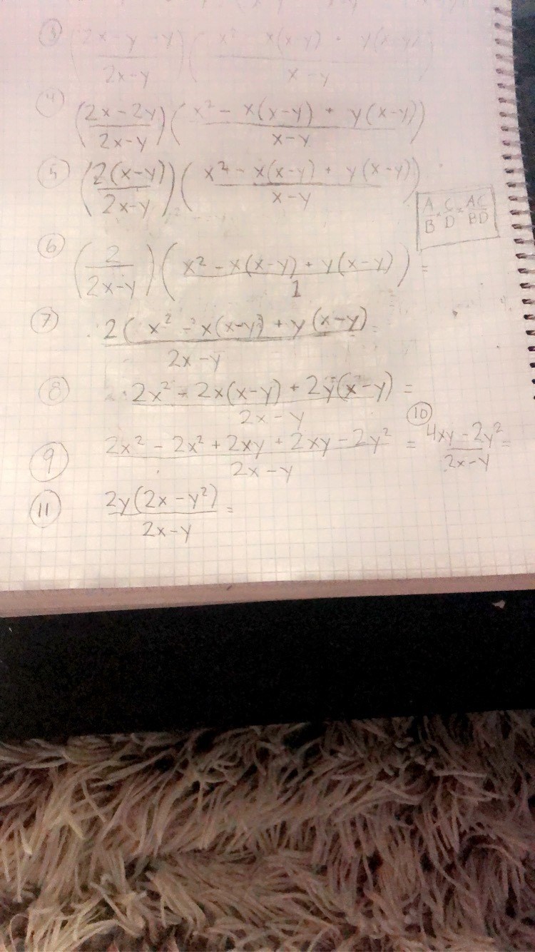 Det är ofta en god idé på såna här uppgifter att faktorisera så långt det går, istället för att utveckla parenteser. För om man hittar samma faktor i både täljare och nämnare, då kan den strykas och så blir allt lättare. Vid steg 3 har du t.ex. fått fram 2x-y-y i vänstra täljaren. Det är samma som 2x-2y, och bryter du ut 2an har du 2(x-y).