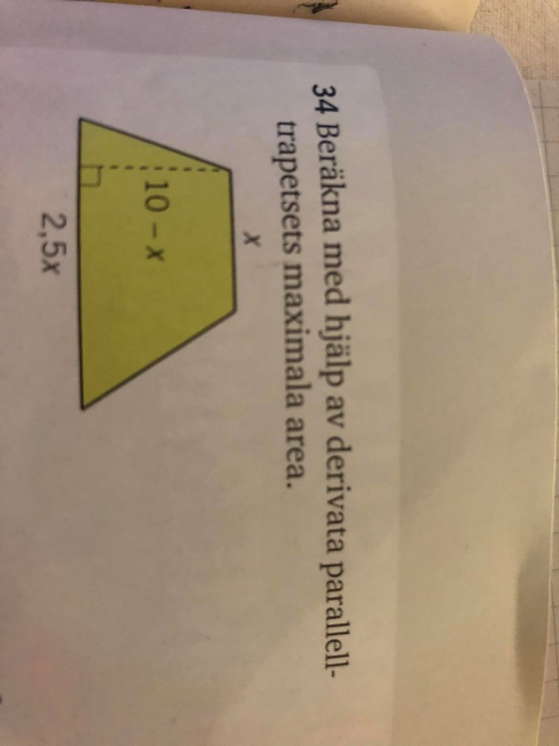 Om du läser uppgiften står det att du inte vara skall ta fram ett uttryck för arean, utan derivera funktionen, sätta derivatan lika med 0 och ta reda på vilket x-värde detta gäller för. När du gjort det skall du sätta in det x-värdet i funktionen du har tagit fram och beräkna den maximala arean.