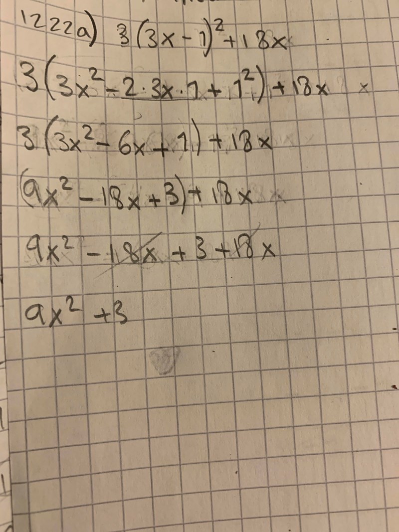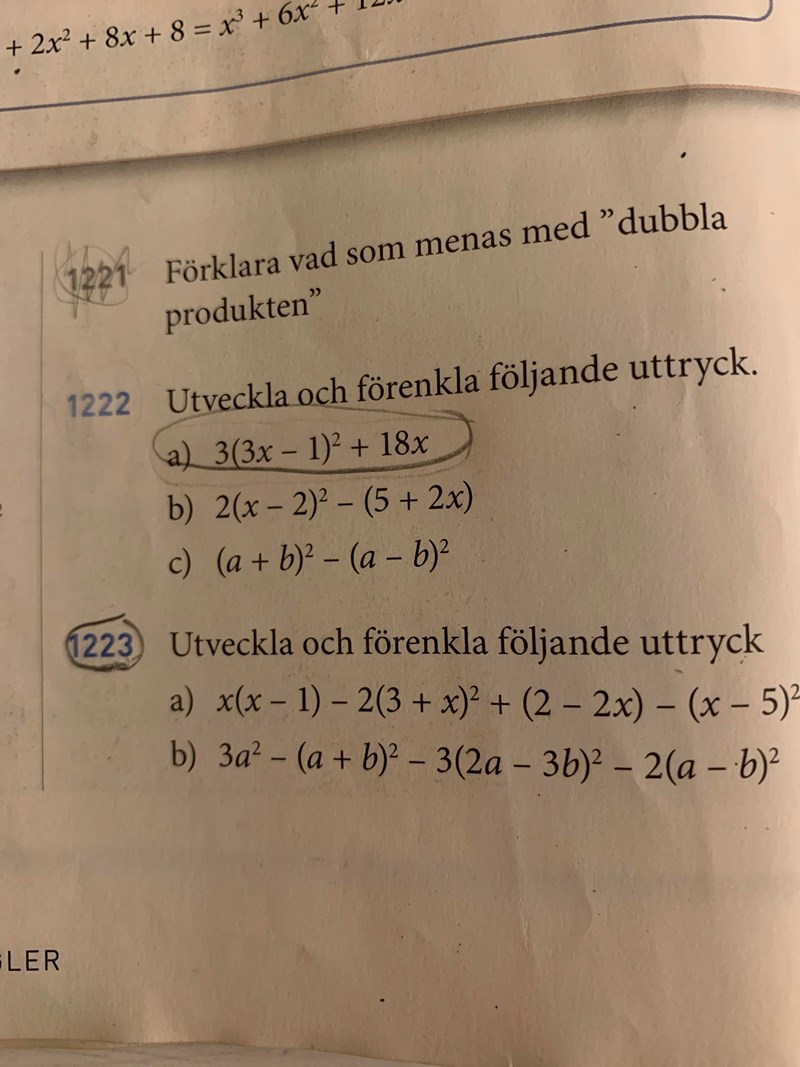 Hur gör jag 1222a? I facit står att svaret är (27x^2)+ 3. Vet inte vad gjort fel. Jag fick svar (9x^2) + 3