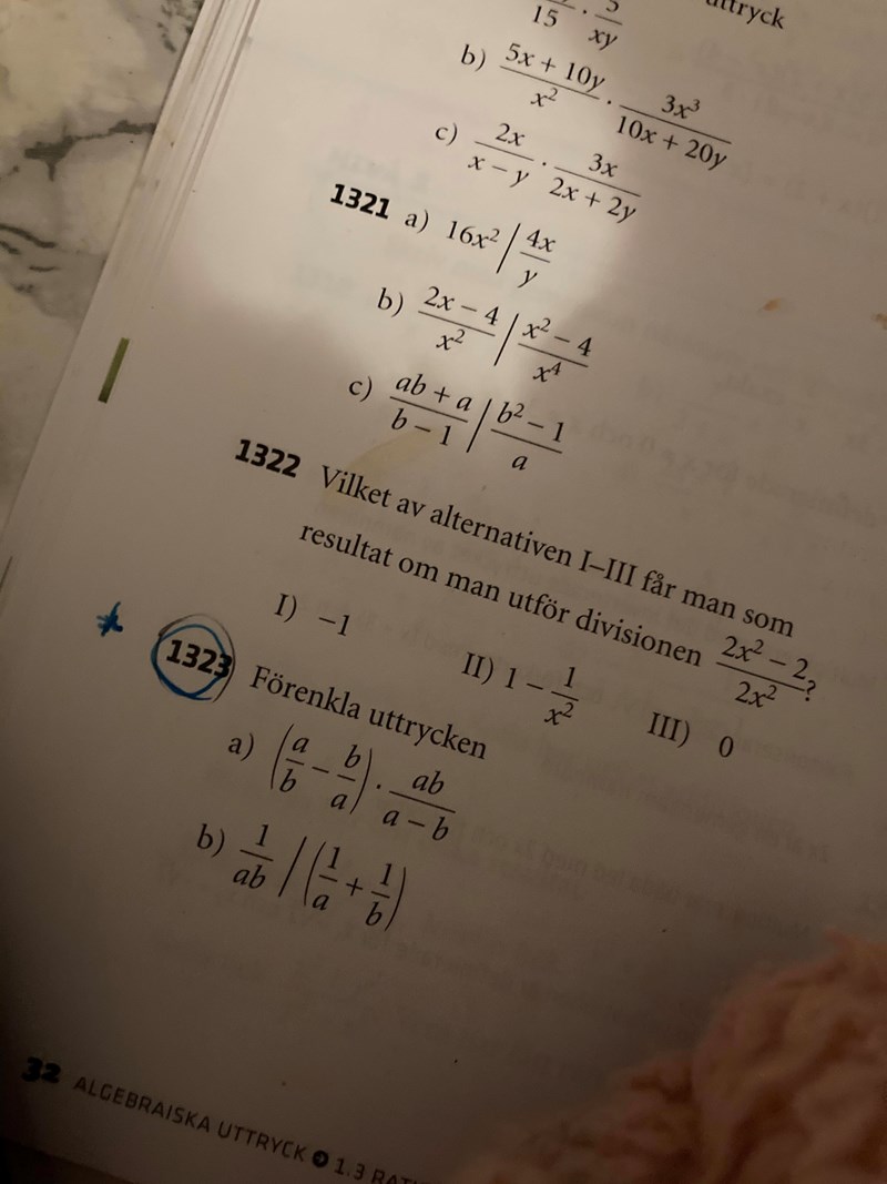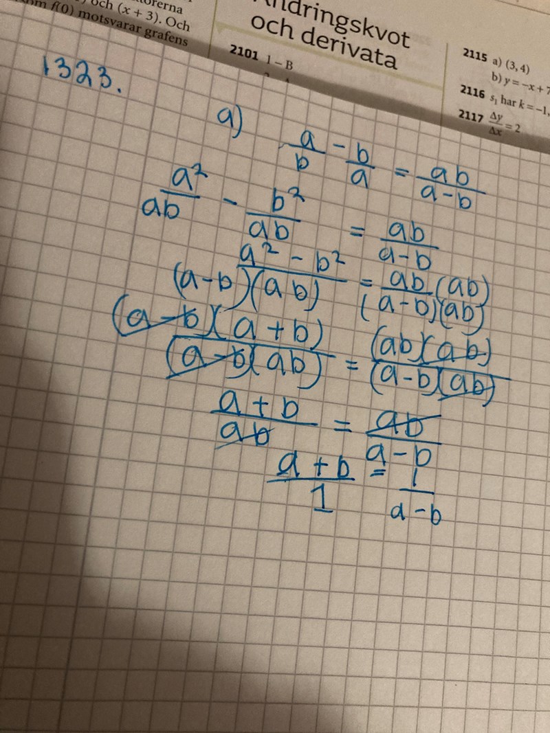 Henrik skrev:Du skall multiplicera det vänstra uttrycket med det högra, då får du b-ab2 (b(a-b) - a(a-b) ) som kan förkortas till: ab(a-b) ab-b2-a2+ab.gNu kan du säkert förkorta ytterligare en gång och hitta det rätta svaret.