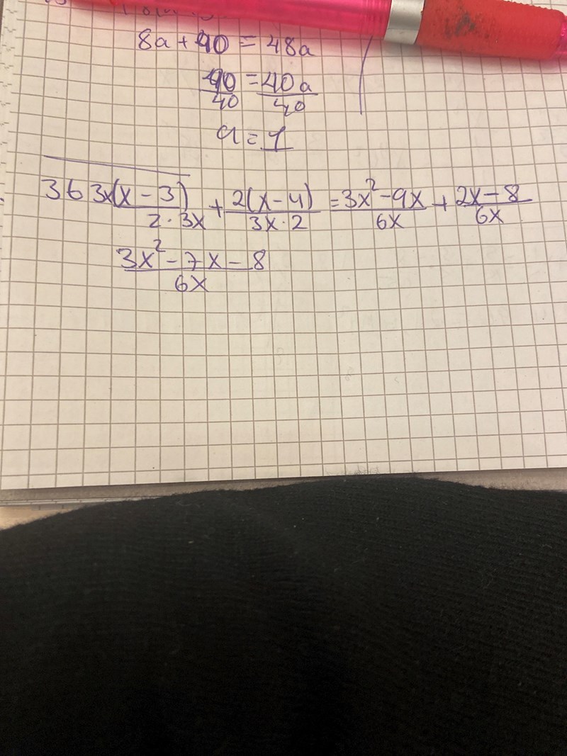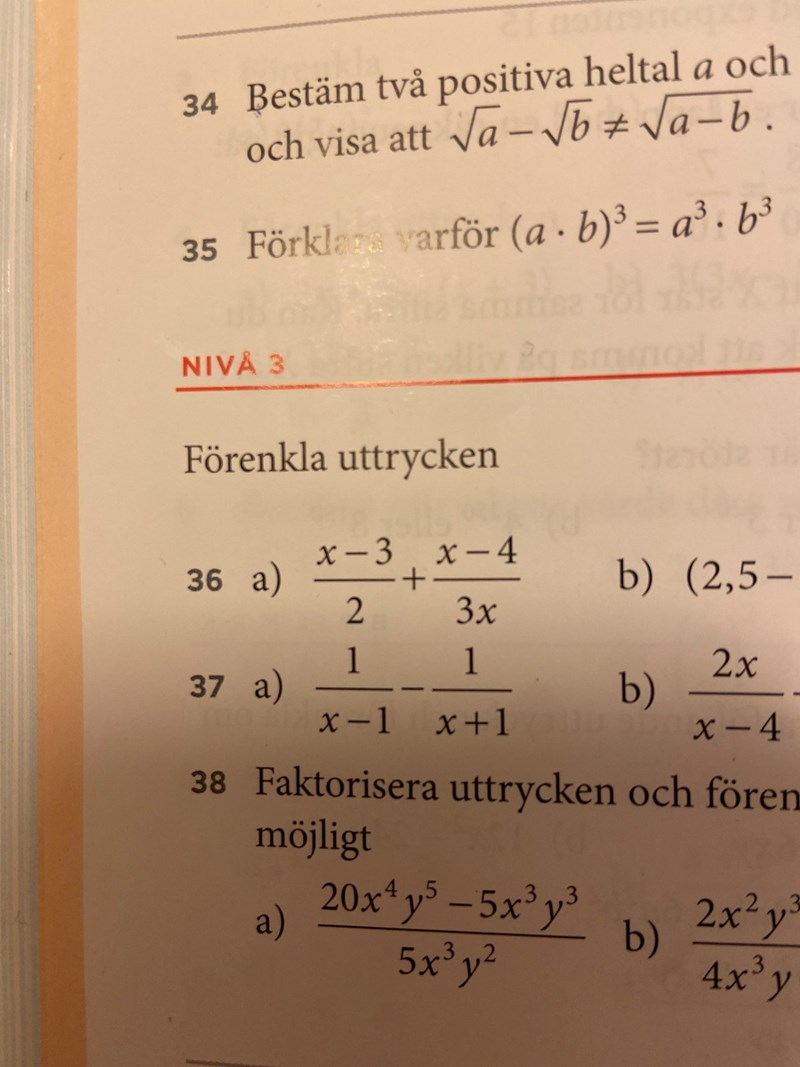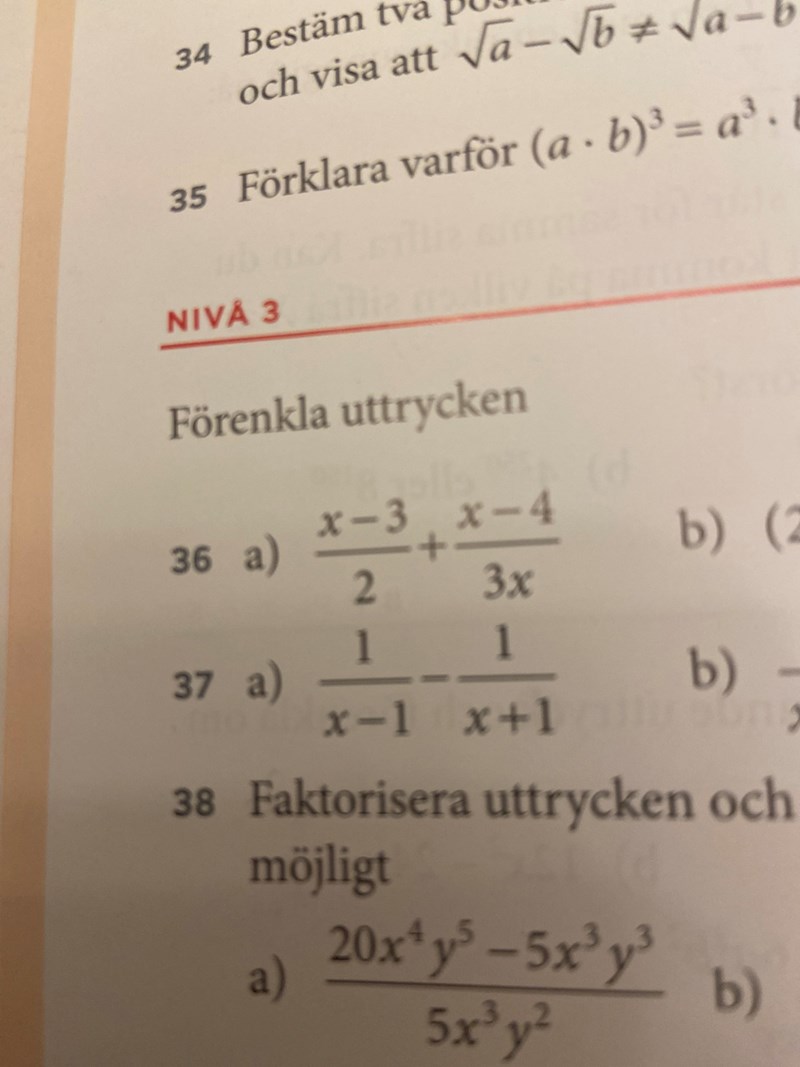 Jag behöver hjälp med 36a) , jag försökte, dock är det ingenting vi har lärt oss och svaret verkade helt annorlunda än vad jag hade tänkt mig. (3x2-7x-8)/6x