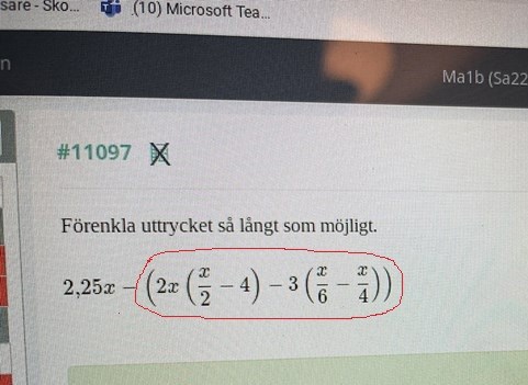 Så här är ju uppgiften och då stämmer det: https://www.symbolab.com/solver/step-by-step/2%2C%2025x-%5Cleft(2x%5Cleft(%5Cfrac%7Bx%7D%7B2%7D-4%5Cright)-3%5Cleft(%5Cfrac%7Bx%7D%7B6%7D-%5Cfrac%7Bx%7D%7B4%7D%5Cright)%5Cright)?or=input