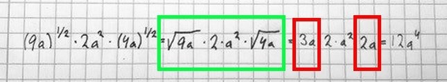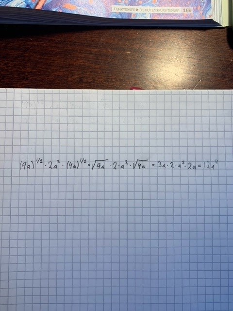 Jag skulle förenkla uttrycket (9a)^1/2*2a^2*(4a)^1/2 och fick det till 12a^4 men i facit står det 12a^3, kan någon hjälpa mig med vad jag gjort fel?