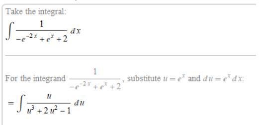 Jag får då ut: , förstår inte vart e^(2x) i nämnaren tar vägen efter substitutionen.