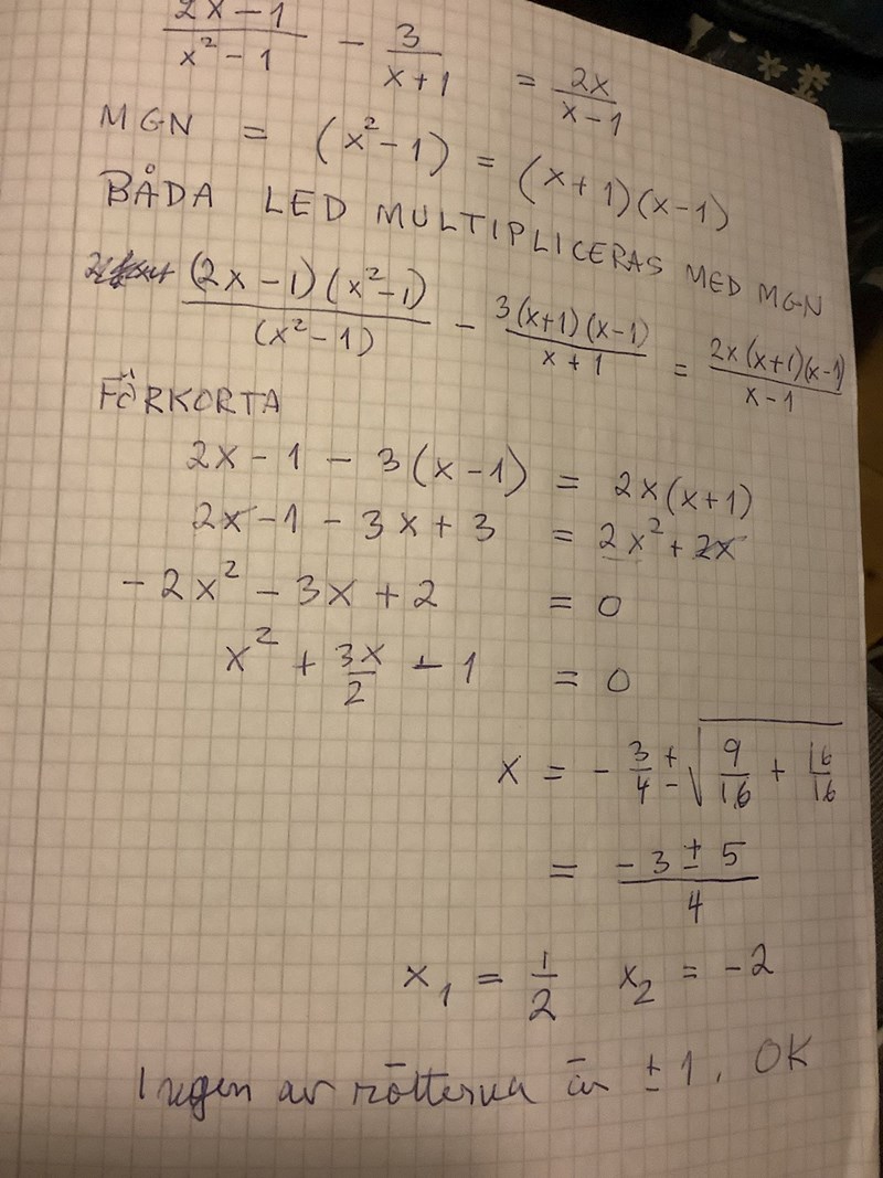 Kom ihåg att om du får x = 1 eller x = –1 så ska de förkastas.