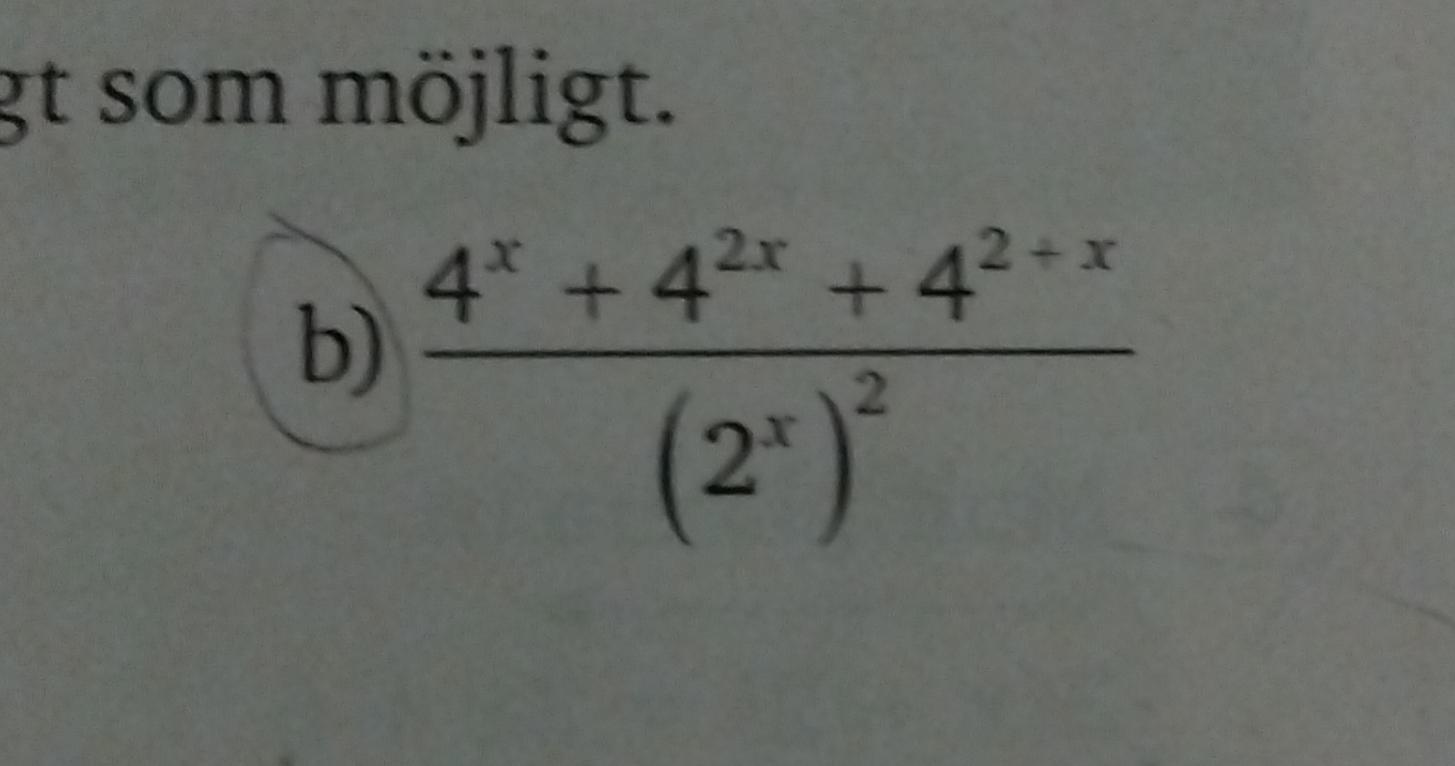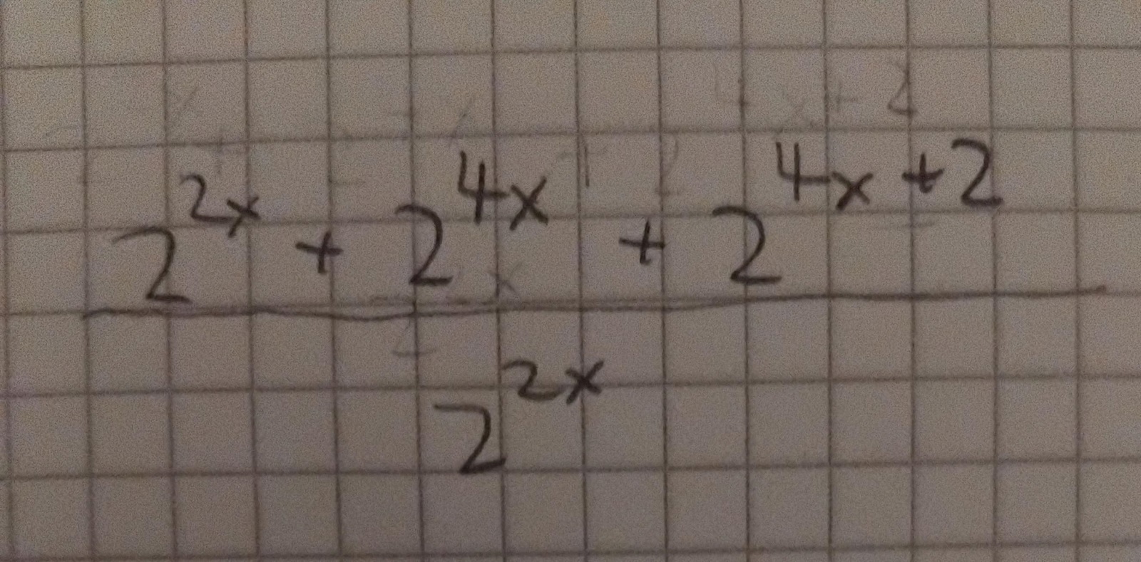 När jag delade varje term med nämnaren 2^2x blev det: 1 + 2^2x + 16 = 4^x + 17. Det borde vara rätt för det står i facit också.