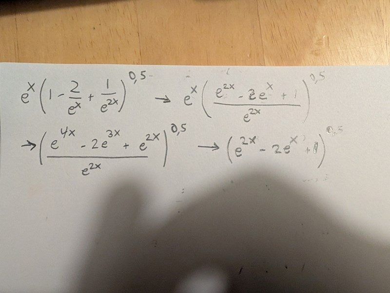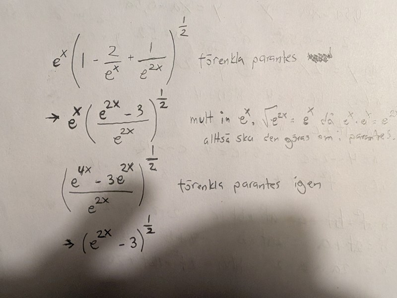 Men jag förstår ju inte.. varför är roten ur e^2x = e^x ? Just det för e^x × e^x = e^2x. Ok vänta ska försöka räkna..