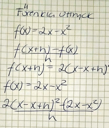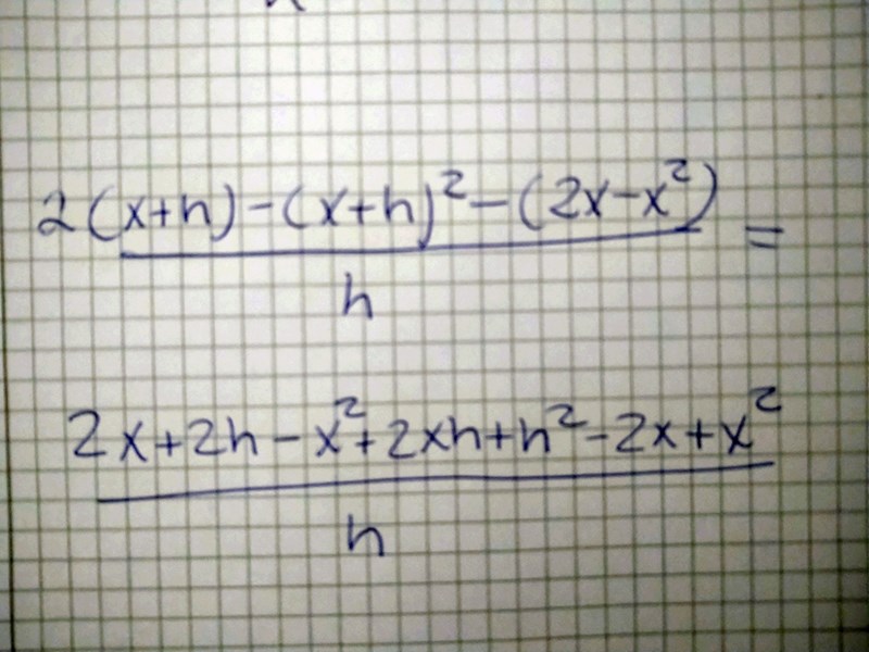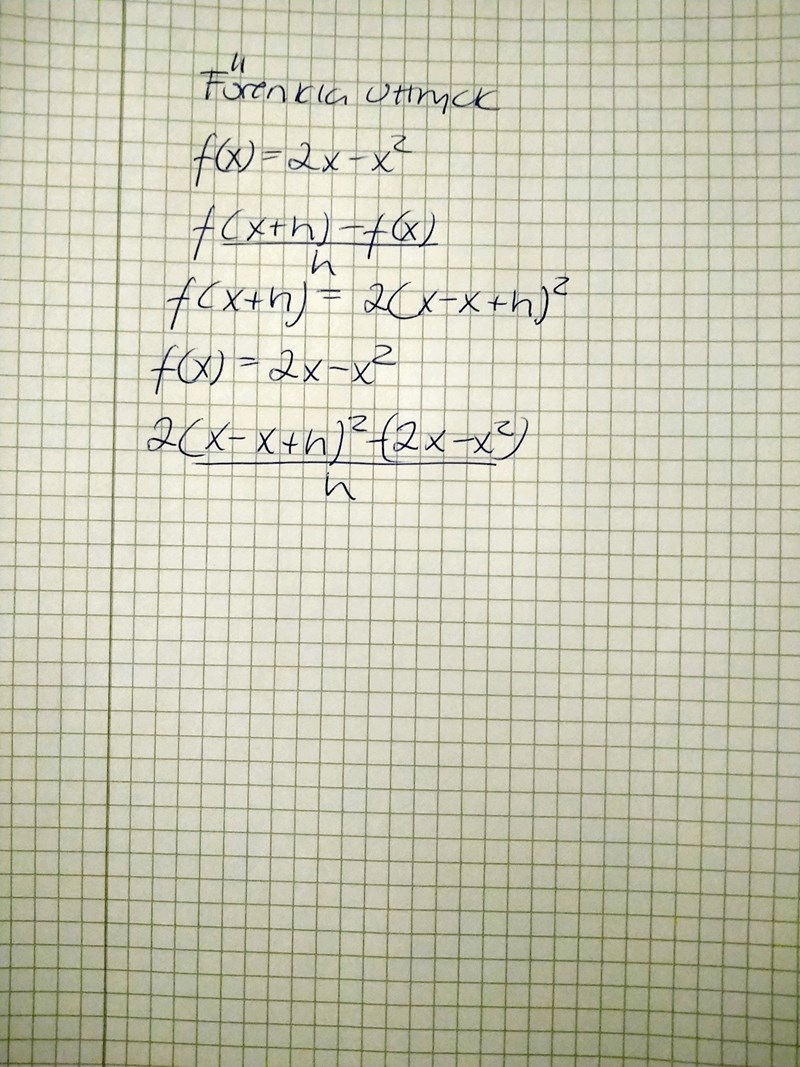 Vill du förenkla uttrycket där ? I så fall stämmer inte det du har skrivit för f(x+h). Det blir f(x+h) = 2(x+h)-(x+h)2.
