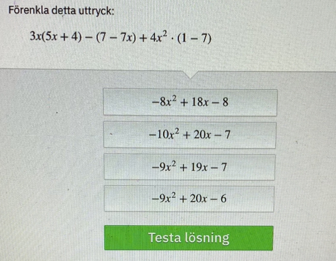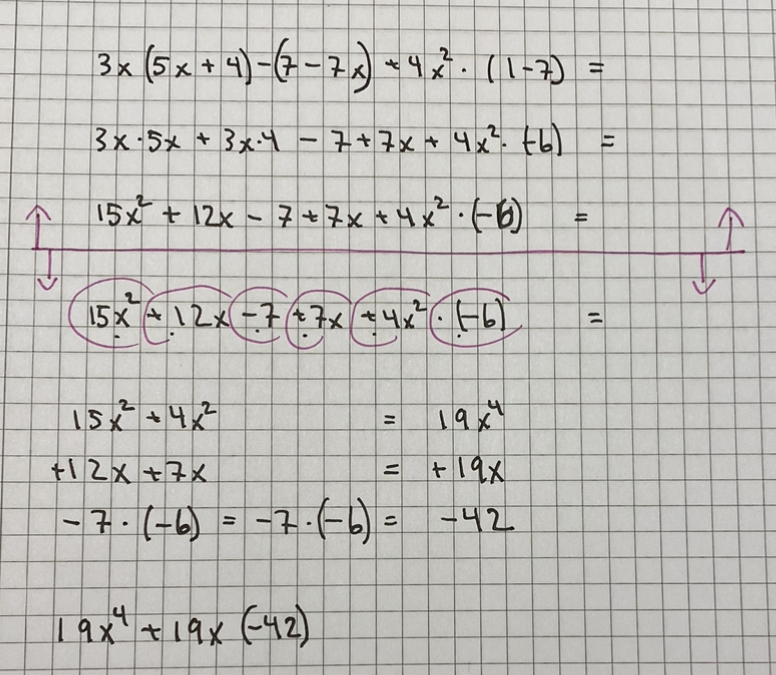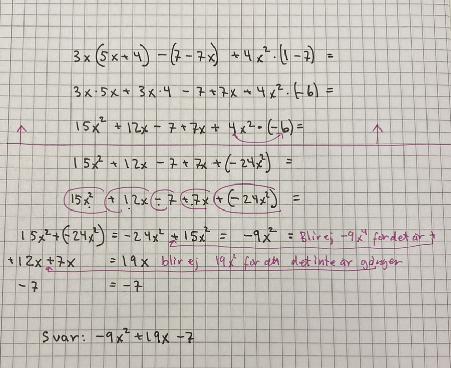 en sak jag kan säga är att jag är osäker på hur jag räknar ut den sista delen i uttrycket, typ de där 4x upphöjt till 2 * (1-7) vet inte om meningen är att jag ska räkna ut de ihop eller för jag förstår faktiskt inte hur man kan gå från 4x upphöjt till 2 och multiplicera de med (-6) går de ens?