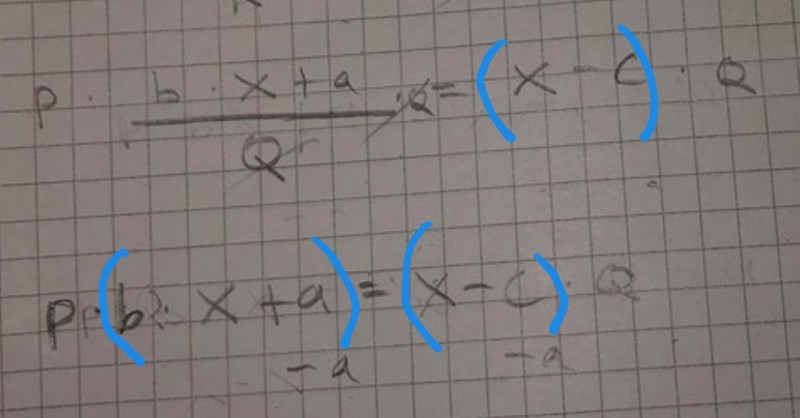 Början är bra, men sen glömmer du att skriva dit nödvändiga parenteser. De behövs för att visa att du multiplicerar hela vänsterledet med p respektive hela högerledet med q.
