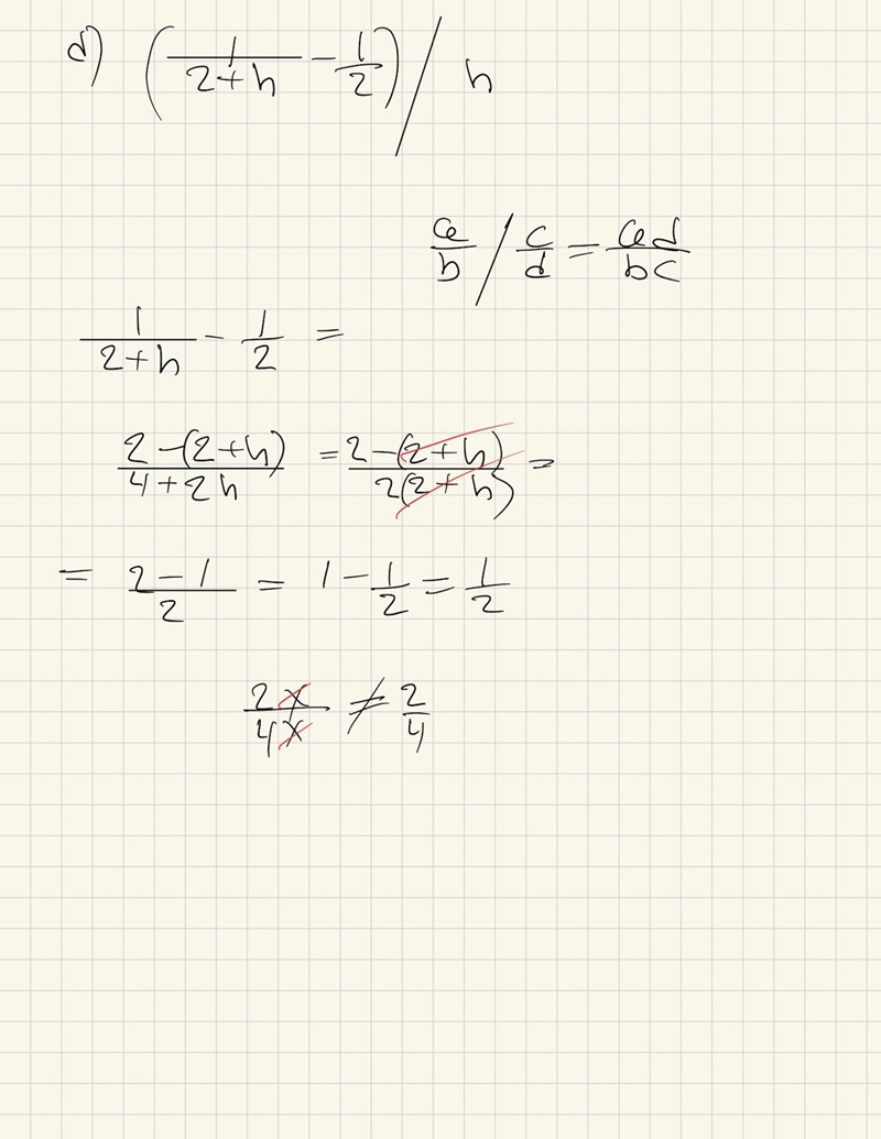 Kan du motivera vad det är för matematisk operation du gör när du stryker 2+h? Det stämmer nämligen inte.