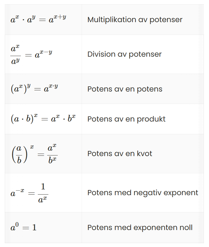 Potenslagarna (och de snarlika logaritmlagarna) behöver man kunna utantill. De är inte så många.