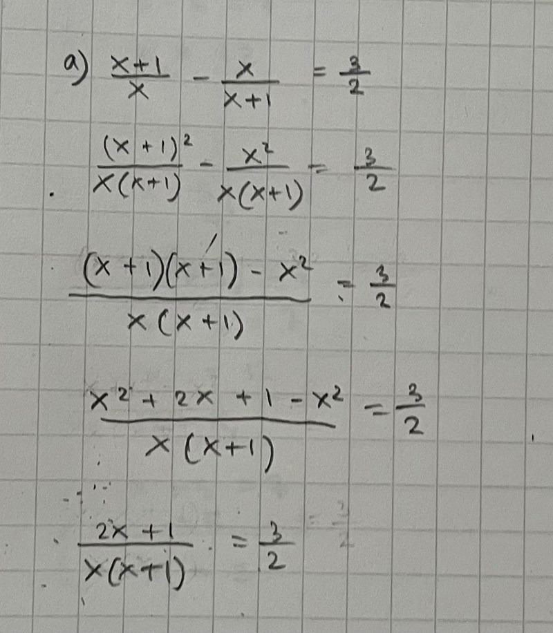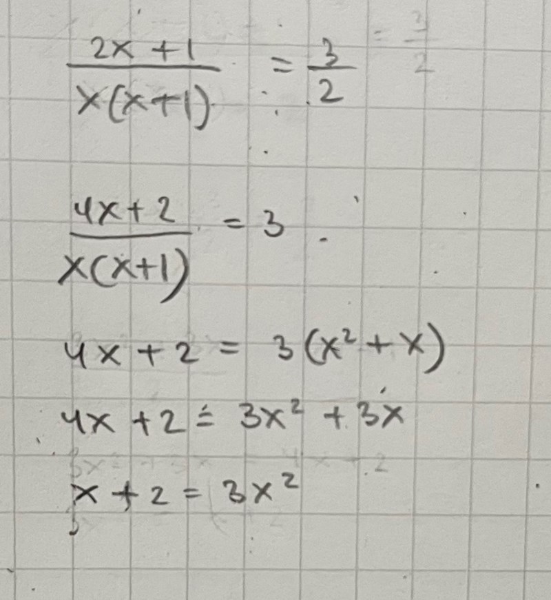 Steg 2: Multiplicera såväl högerled som vänsterled med x(x+1) för att bli av med nämnaren i vänsterledet.