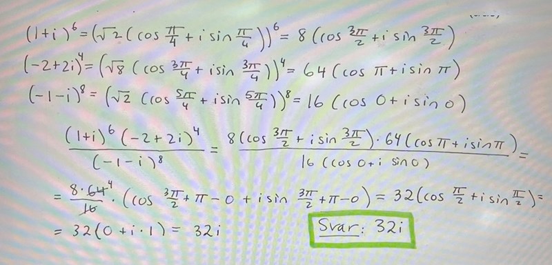 Jag gjorde nyss uppgiften nedan. Jag kom nästan fram till rätt svar. Jag fick -32i medan det korrekta svaret blev 32i. Jag kollade därför lösningsförslaget för att se vad som blev fel och då såg jag att dem hade skrivit att (-2+2i)4 = 64 = , medan jag kom fram till att det blev -64, (då cos (3pi) = -1) se min lösning nedan. Jag undrar vad för fel jag har gjort?