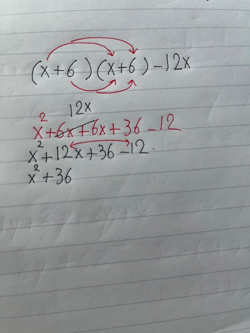 Du kommer fram till rätt svar mha. lämplig uträkning, men du glömmer bort att det skall stå -12x sist på två av raderna, inte endast -12.