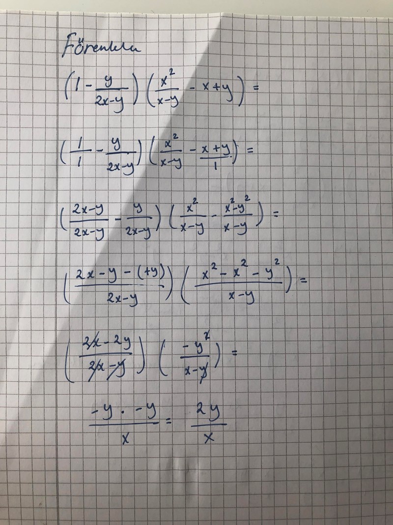 I näst sista raden händer det förbjudna saker. Man kan inte förkorta enbart en term i ett binom. Binomet måste innehålla en GEMENSAM faktor och det har du inte vare sig första eller andra parentesen. Det är bara den gemensamma faktorn (om den skulle finnas) som kan förkortas bort.