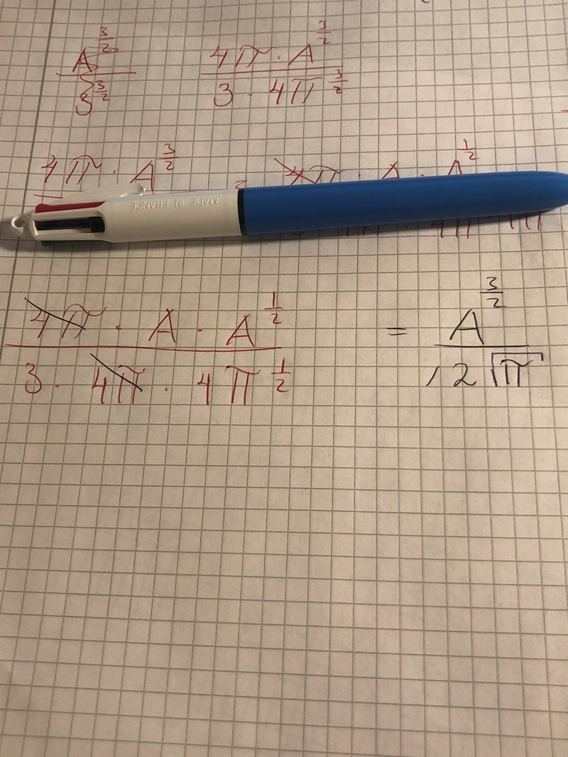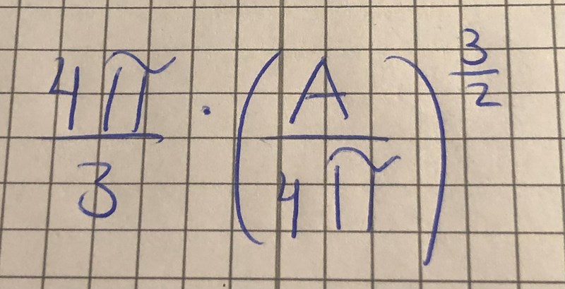 4π3(A4π)32= 4π3A4π(A4π)12=A3*2(Aπ)12