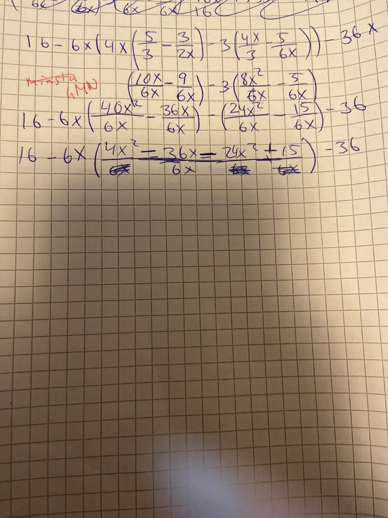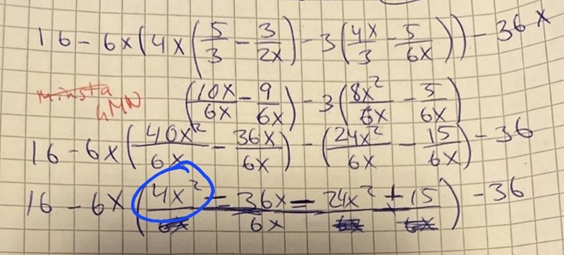 Ska jag börja med att räkna från de inre parenteserna med bråken eller från 6x?